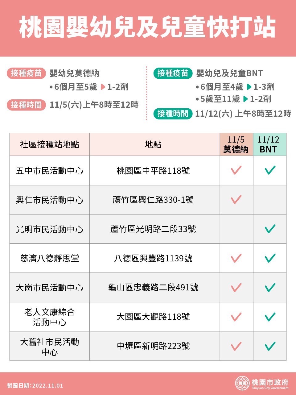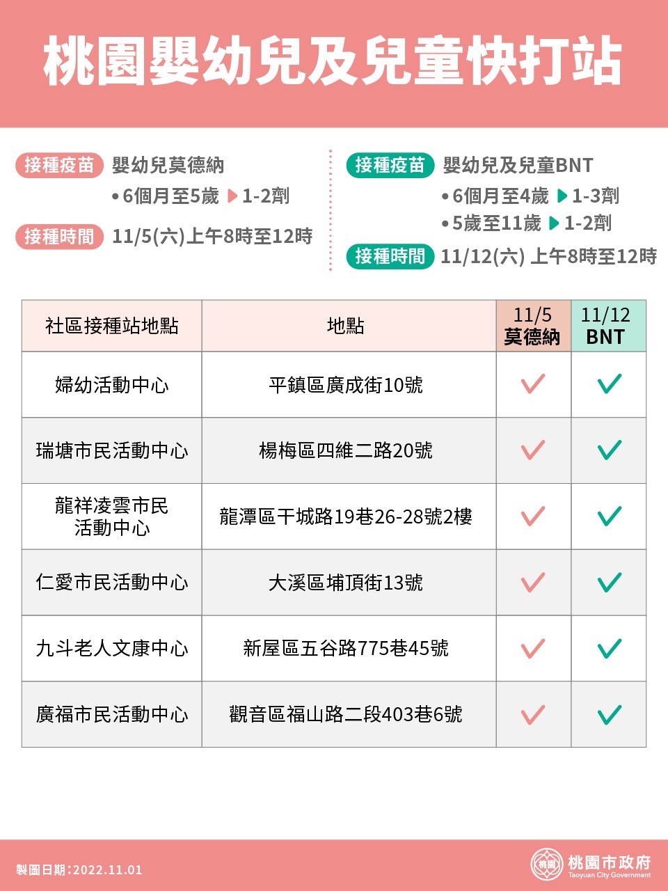 為持續提升桃園市嬰幼兒及兒童( 6 個月~4 歲及 5~11 歲)之集體保護力,本週 11/12 (六)上午 8-12 時開設社區疫苗接種站,各接種站訊息詳如附件。